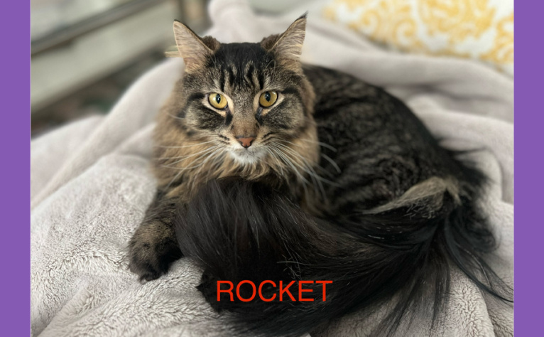 - Rocket, who was adopted in 2023, is the youngest of our kittens. We call him a fraidy-cat, but he is oh so sweet and looks like an owl because of his goofy, long hair around his face.