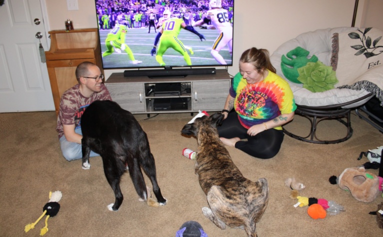 Our dogs are currently our “children.” Ripley is a 13-yr old Australian Shepherd/Leonberger mix. She is too smart for her own good and has loved babies since she was one herself. Rufus is an 11-yr old Boxer mix. His head is bigger than any we’ve ever seen, but he still thinks he is a cat (because he grew up in a foster family with 9 of them). He is the best cuddler and definitely likes to curl up on the couch.